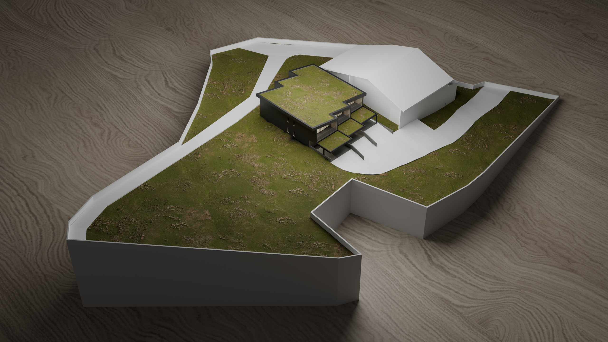 Ein extensiv begrüntes Gründach unterstützt die Einbindung in die Landschaft und trägt zur ökologischen Qualität des Bauwerks bei. Der Neubau schließt unmittelbar an das bestehende Diensthaus an. Insgesamt entsteht ein zurückhaltendes, zeitgemäßes Gebäude, das Funktionalität, Nachhaltigkeit und landschaftliche Einbindung in Einklang bringt