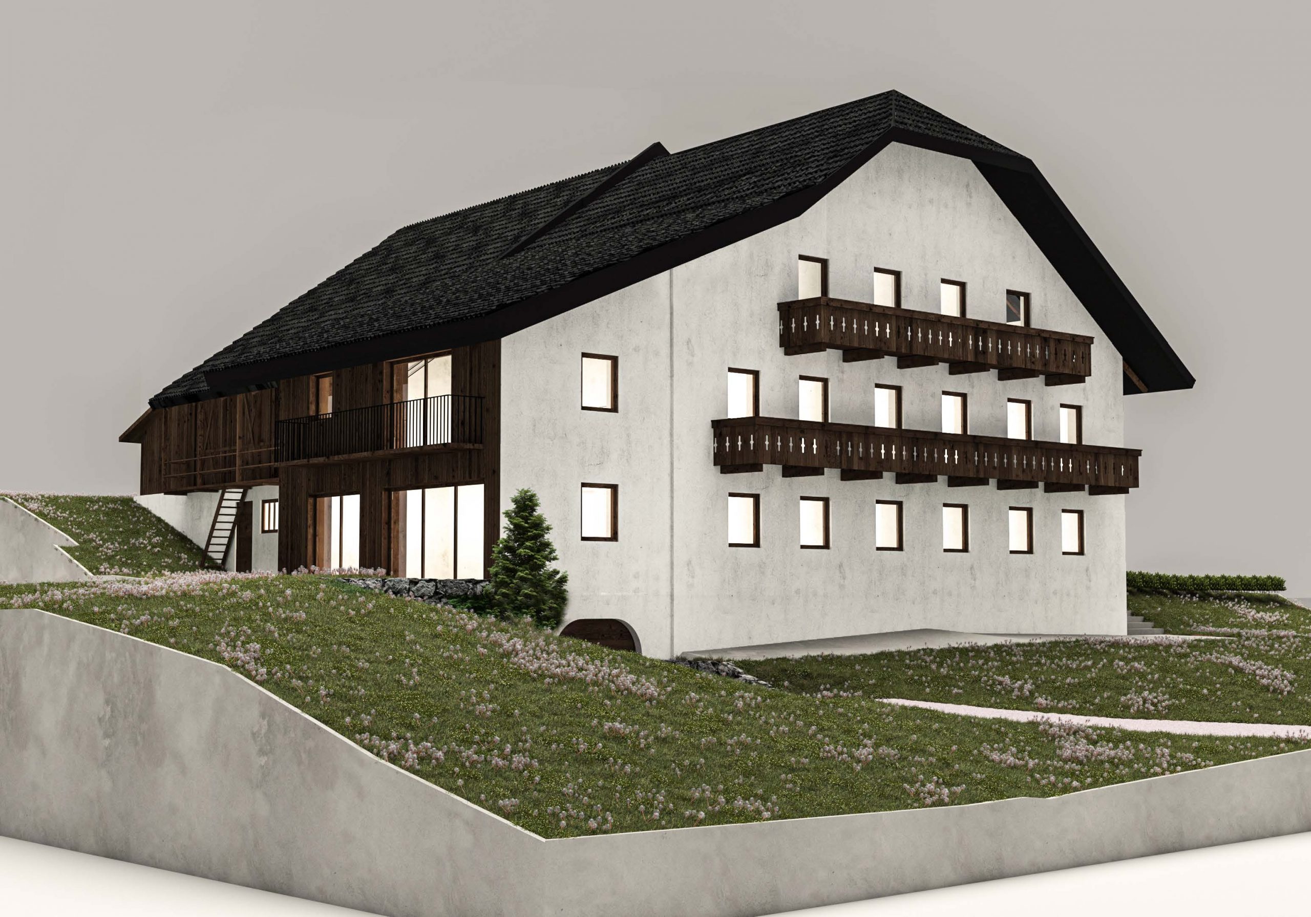 Prägendes Gestaltungselement ist der Einsatz von lokalem Lärchenholz, das teilweise aus dem rückgebauten Bestandsgebäude übernommen und wiederverwendet wurde. Dadurch entstand eine materielle Kontinuität, welche die Geschichte des Ortes spürbar fortschreibt. Ergänzend dazu wurden zeitgemäße architektonische Elemente integriert, die den Bestand nicht imitieren, sondern respektvoll ergänzen. Großzügige Glasflächen öffnen die Gebäudehülle gezielt und ermöglichen lichtdurchflutete Innenräume.
